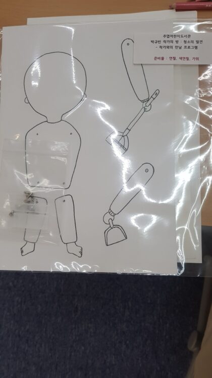 작가가 그림책을 만든 과정을 소개하고 그림책을 만들며 마주한 여러 가지 환경오염과 관련된 이야기들도 해준다. 그림책 독후 활동 시간에는 청소하는 모습의 캐릭터로 할핀 종이 인형 만들기를 한다.