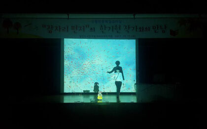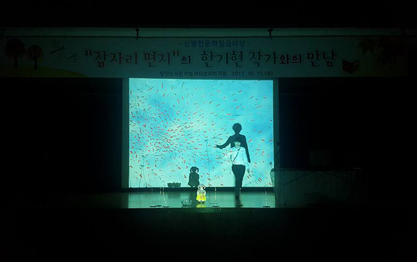 1인극에 사용되는 소품과 도구, 그리고 음악을 이용하여 연극적 요소가 가미된 낭독 퍼포먼스를 보여준 뒤 작가의 강연(그림책 제작 과정과 딱지 모양의 책 편지가 아이들에게 전하고 싶은 메시지)이 이어집니다.